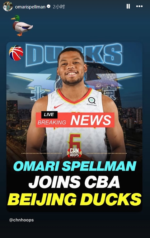 09月03日讯 曾经在勇士队效力过的内线外援斯佩尔曼自宣加盟北京首钢男篮,他在个人社交媒体上转发了相关报道,并配上一个🦆的表情。