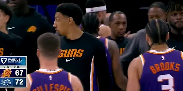 比赛第三节,杰伦-格林抢断单臂劈扣,太阳下半场开局轰出11-2打停魔术。