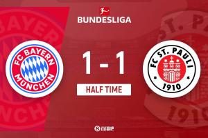 上半场伤停补时3分钟,半场结束,拜仁暂1-1圣保利。
